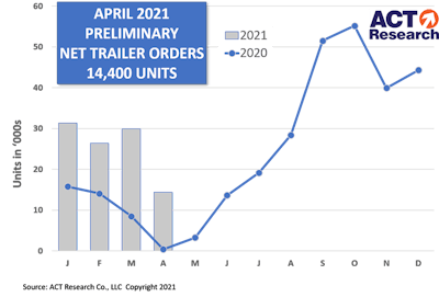The new trailer order market has come back to earth. After growing for six consecutive months in the latter half of 2020 and averaging nearly 30,000 units during the first quarter of 2021, preliminary trailer orders fell to 14,400 units in April, ACT Research reported last week.